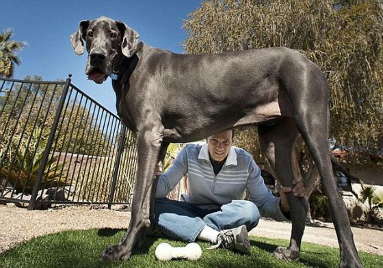 У хозяина самой большой собаки в мире -- кроссовки самого большого размера в мире , и голова самая маленькая в мире. Без параллакса никак нельзя было снять. Болялись, что я не поверю, что собака большая, решили увеличить на всякий случай.