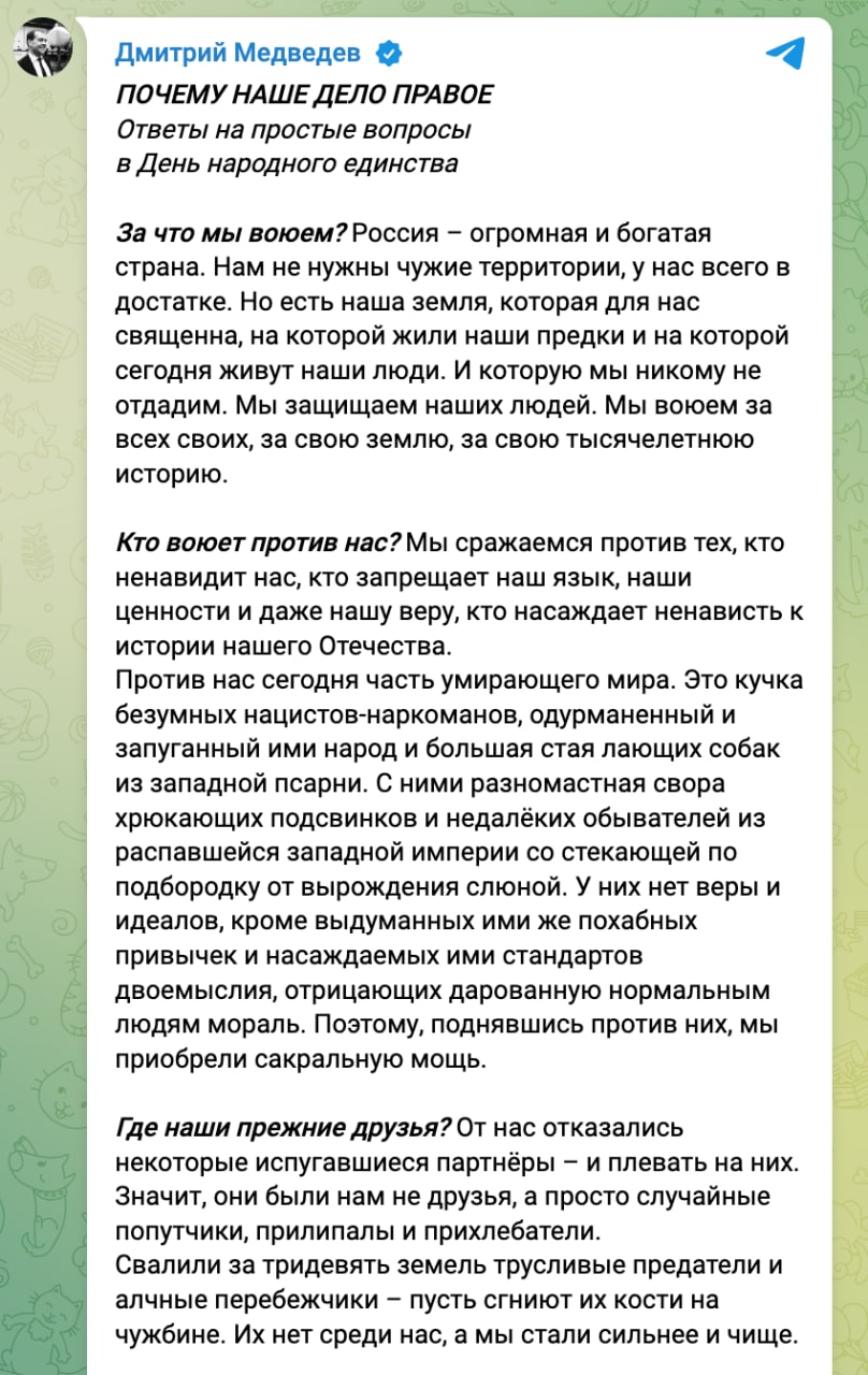 Против нас сегодня часть умирающего мира. Это кучка безумных нацистов-наркоманов, одурманенный и запуганный ими народ и большая стая лающих собак из западной псарни. С ними разномастная свора хрюкающих подсвинков и недалёких обывателей из распавшейся западной империи со стекающей по подбородку от вырождения слюной. У них нет веры и идеалов, кроме выдуманных ими же похабных привычек и насаждаемых ими стандартов двоемыслия, отрицающих дарованную нормальным людям мораль. Поэтому, поднявшись против них, мы приобрели сакральную мощь.