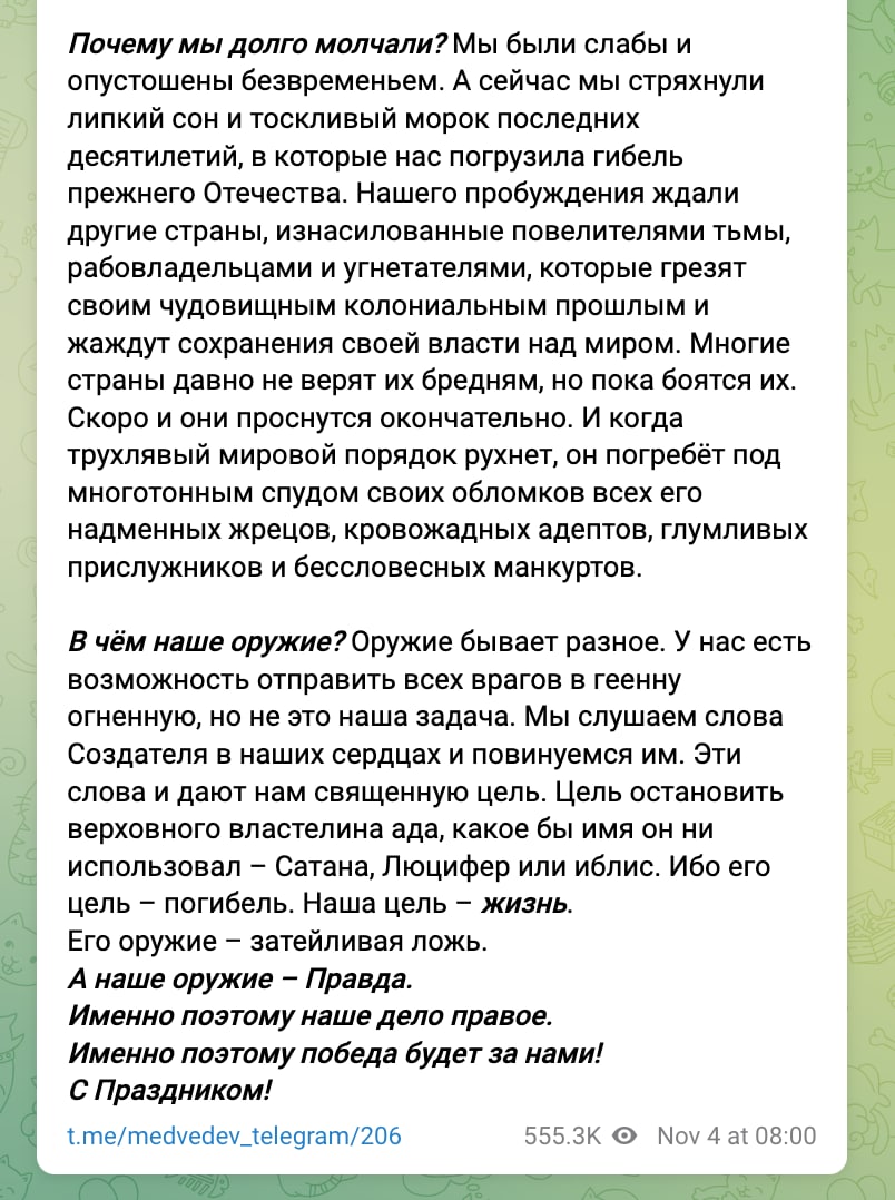 Почему мы долго молчали? Мы были слабы и опустошены безвременьем. А сейчас мы стряхнули липкий сон и тоскливый морок последних десятилетий, в которые нас погрузила гибель прежнего Отечества. Нашего пробуждения ждали другие страны, изнасилованные повелителями тьмы, рабовладельцами и угнетателями, которые грезят своим чудовищным колониальным прошлым и жаждут сохранения своей власти над миром. Многие страны давно не верят их бредням, но пока боятся их. Скоро и они проснутся окончательно. И когда трухлявый мировой порядок рухнет, он погребёт под многотонным спудом своих обломков всех его надменных жрецов, кровожадных адептов, глумливых прислужников и бессловесных манкуртов.