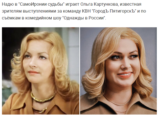 Женю Лукашина продемонстрирует комедийный актер Тимур Батрутдинов, Галю покажет телезрителю певица Ольга Бузова. В фильме найдется место даже Ивану Грозному в исполнении юмориста Азамата Мусагалиева. (Отсюда.)