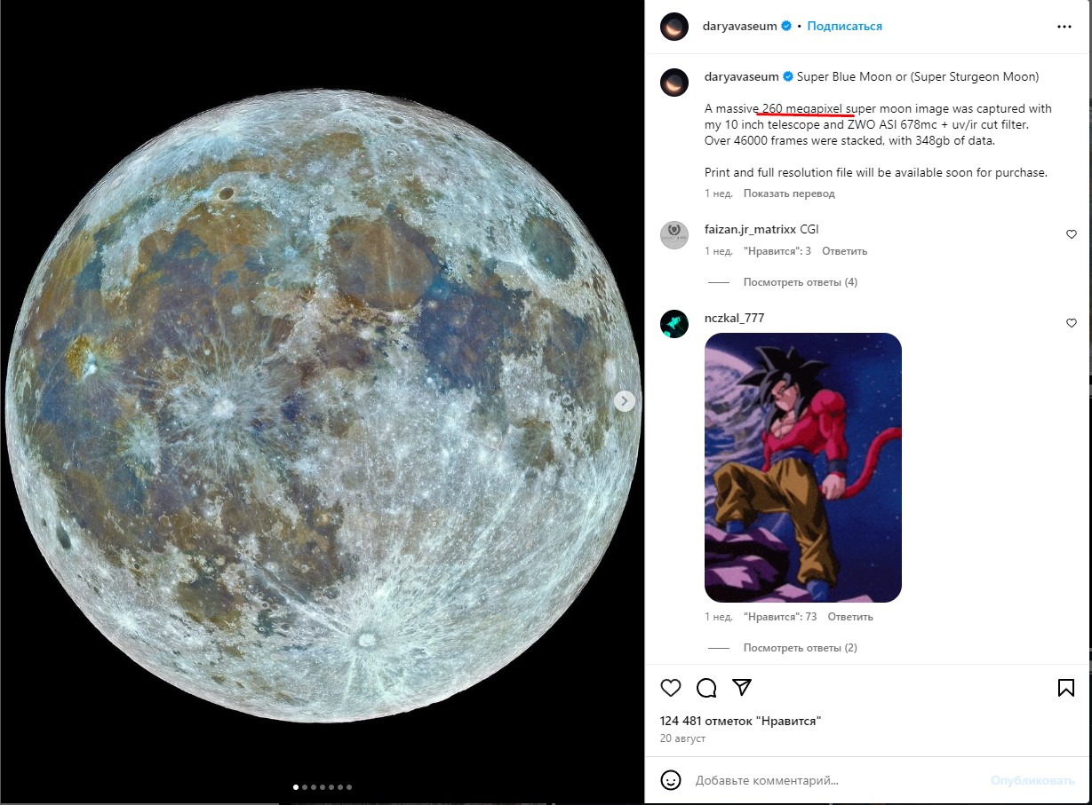 Но ещё год назад сняли картинку на 1.3 гигапикселя из 280 тысяч фото (и она у МакКарти не единственная, он регулярно Луну снимает): universemagazine.com