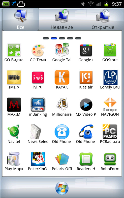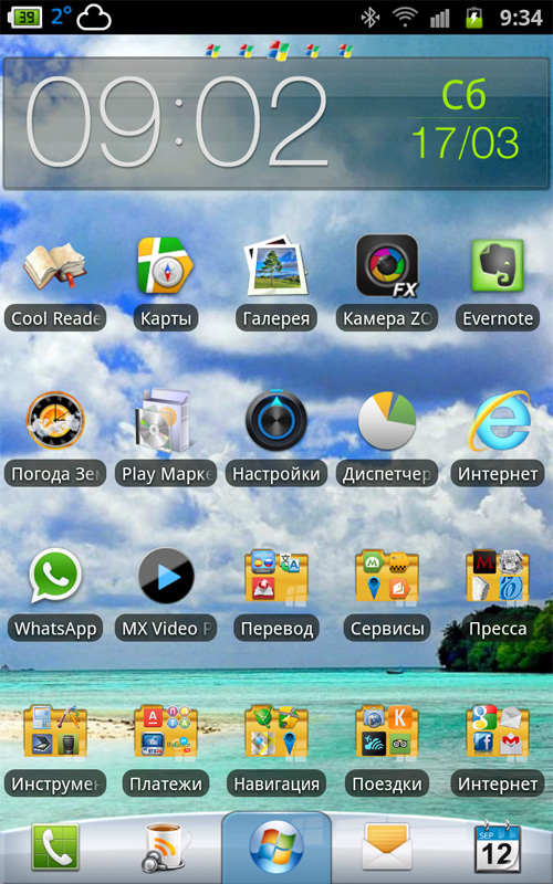 Оболочку поставил Go Launcher (на мой взгляд, лучшая из всего, что пробовал) с прикольной темой Windows7.