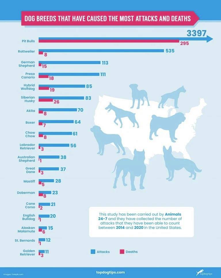 Вот такая статистика с сайта Topdogtips. Синяя линейка - нападения, красная - смерти. Питбули там совершенно вне конкуренции. Но интересно то, что хаски убили больше людей, чем гибрид собаки с волком.