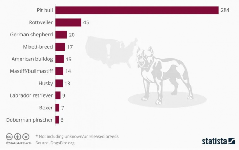 И вот еще статистика смертельных атак собак различных пород из издания Forbes. Статистика, правда, неновая, но я не думаю, что сейчас картина принципиально другая.