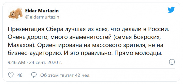 Я презентацию осилил только до Боярского. На том месте, где первый зампред правления Сбербанка при встрече с Канальей заявил, что "Во мне сейчас дико ликует ваш фанат и давний поклонник, и я еле-еле сдерживаюсь, чтобы на закричать вашу знаменитую фразу.." кот Бублик понял, что ему срочно нужно навестить ведро. А я более выдержанный, я эпизод досмотрел до конца.