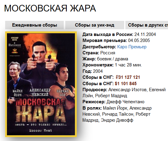 Ну и еще контрольный выстрел в Курицына. "Московская жара". На "Кинопоиске" - $1100000. Ну да, "Московская жара" миллион сто долларов, все, конечно, поверили. На ЕАИС - ноль. Еще раз - ноль! У него было прокатное удостоверение, но фильм попросту не прокатывали, он вышел сразу на DVD.