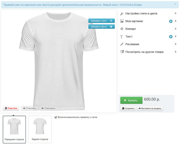 Там можно настраивать стиль и цвет, размещать на футболке свои картинки (фото), выбирать картинки из набора клипартов, размещать и редактировать текст, рисовать прямо на футболке. И это, соответственно, можно делать на передней и задней стороне футболки.