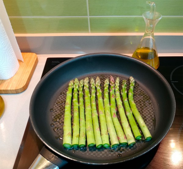Разогреваем сковородку, выкладываем ровно спаржу и сверху ее сбрызгиваем маслом.