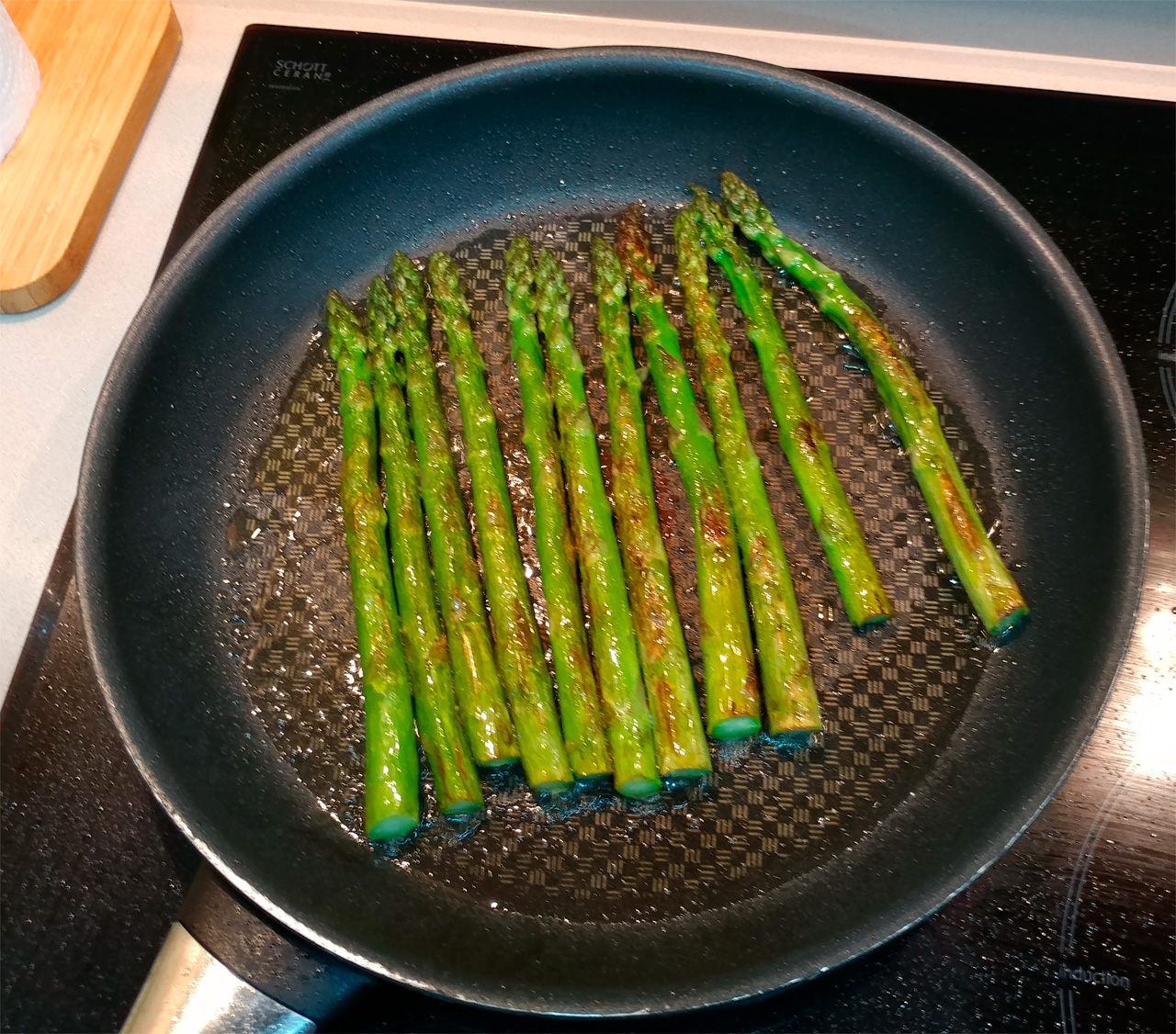 Я обычно жарю где-то пять минут на одной стороне и пять минут на другой. Можно также прожарить с торцов, но смотрите, чтобы не пережарить - спаржа тогда станет мяклая и невкуслая.