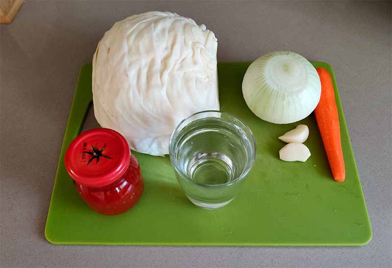 Итак. Свежайшая белокочанная капуста, на кило капусты - луковица-репка, морковка, пара долек чеснока, томат-паста или растертые томаты, стакан воды. (Если вилок капусты в два кило - все удваивается, как и конечный выигрыш.)