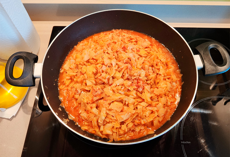 Таймер прозвенел - снимаем крышку, добавляем туда две столовых ложки томат-пасты на 1 кг капусты (или две банки растертых томатов), выдавливаем пару долек чеснока, очень тщательно перемешиваем и снова под крышку еще минут на пятнадцать, при этом периодически перемешивая.