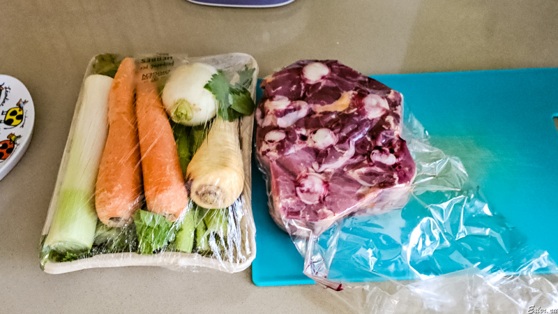 Бычий хвост мне сразу при покупке мясник разрезал по позвонкам. Я их дома помыл. В кастрюле с толстым дном положил топленое масло и обжарил на нем хвост до образования корочки. Потом это залил водой так, чтобы она покрывала на фалангу пальца хвост. Положил туда две веточки розмарина, 5 ягод можжевельника, две луковицы с шелухой, много порея, много моркови, корень петрушки. Снял шом. Все это варил полтора часа. Потом снял, вынул хвост, процедил бульон. Хвост опять положил в бульон, снял пену. Потом добавил хорошую дозу красного вина. И варил ещё три с половиной часа. Примерно минут за сорок до конца положил в суп картошку целиком - это было отступление от оригинального рецепта. После того, как суп был готов, вынул хвост и обобрал мясо с костей. Мясо вернул в суп. Суп вышел очень темным. Но очень вкусным и очень нажористым: мы с другом его продегустировали часов в шесть вечера. Оба не хотели есть до следующего вечера.