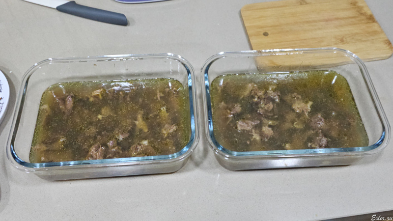 Вытаскиваем мясо, снимаем его с костей - после 9 часов снимается очень легко. Кости выбрасываем, мясо режем (или рвем) на кусочки, кладем ровным слоем в емкость, заливаем бульоном. Можно туда класть вареную морковку, петрушку и порезанный свежий чеснок, но я этого не делаю.