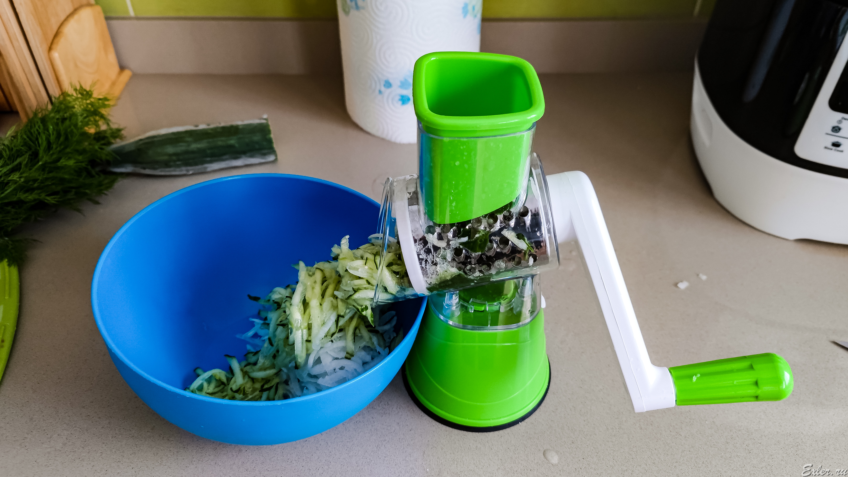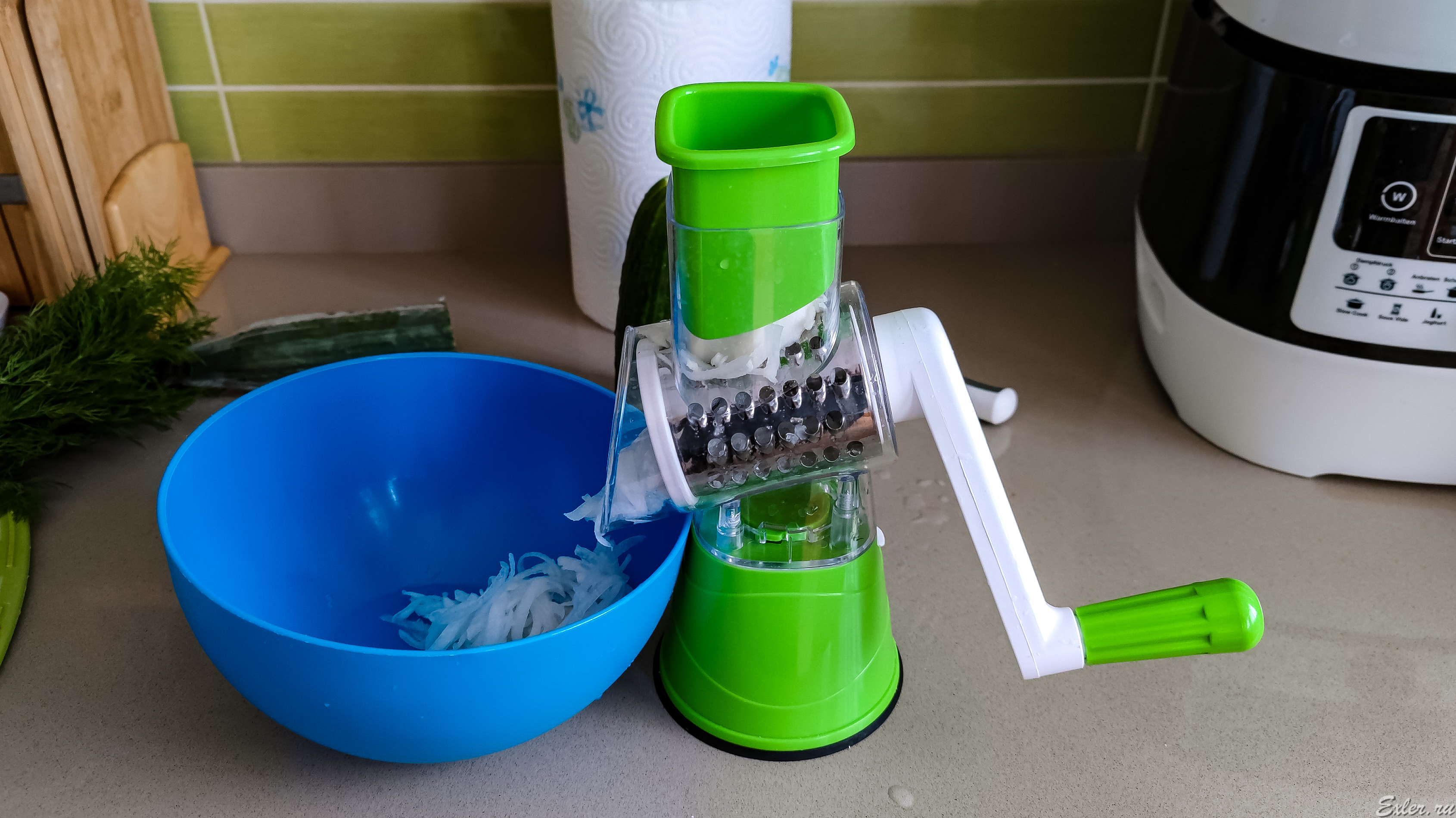 Кстати, вот эта терка, которая на фото, гениальная совершенно! Когда я ее купил на Али 2,5 года назад, мне несколько человек написали, что терка обязательно навернется максимум через месяц. Так вот, она у меня активно использовалась все это время и до сих пор как новенькая. Значительно ускоряет процесс (с обычной теркой все намного дольше и грязнее), элементарно разбирается и моется, имеет еще две насадки. Плюс - у нее достаточно надежная присоска, закрепляющая эту терку на столе, так что с ней совсем все более чем удобно. (По моей тогдашней ссылке ее уже нет, но вот здесь можно купить с доставкой с российского склада.)