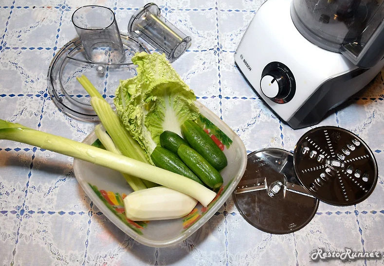 У меня есть более развернутая версиятого же салата, в которую входит китайская капуста, лук порей и сельдерей. Получается еще вкуснее. И простая версия, когда вместо огурцов добавляем кольраби. Но туда же можно и огурцы.