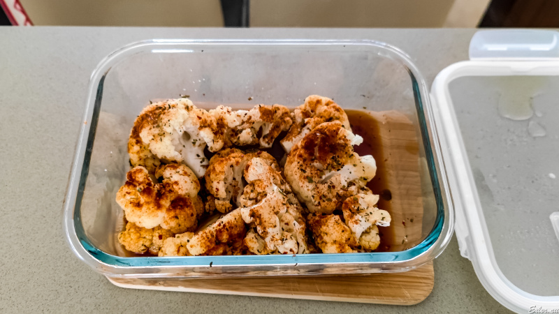 Теперь я ее готовлю следующим образом. Кочан капусты разобрать на соцветия, крупные соцветия порезать на несколько частей. Покидать это все в стеклянную емкость, от души полить соевым соусом, специи по вкусу: я не солю, добавляю острую паприку, кайенский перец, сухой чеснок и прованские травы. Обязательно накрыть емкость крышкой, после чего в микроволновку на полную мощность (800) примерно на 7 минут.