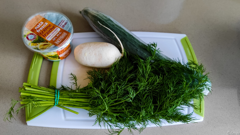 Ингредиенты - дайкон, огурец (несколько огурцов, если они небольшие), зеленый лук, укроп. Специи и заправка - по вкусу.