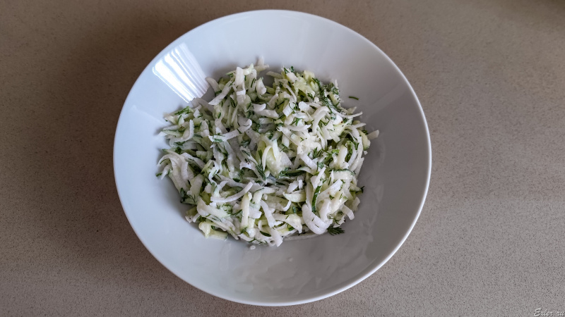 С огурцами проделываем ту же операцию - натираем на крупной терке. Где-то советуют огурцы нарезать соломкой, но мне значительно больше нравится именно натирать на терке.