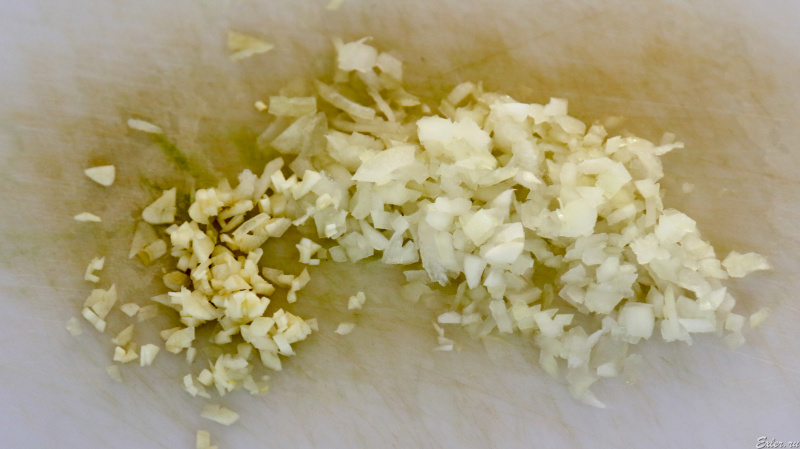 Берем четверть луковицы, дольку чеснока и мелко-мелко это все режем. Если мелко нарезать не получается, то нужно дополнительно измельчить лук и чеснок ножом, держа его двумя руками с двух сторон - так точно получится измельчить.