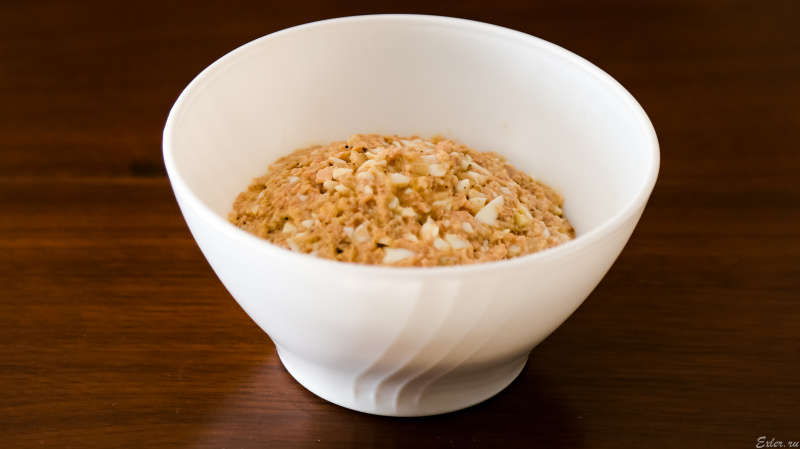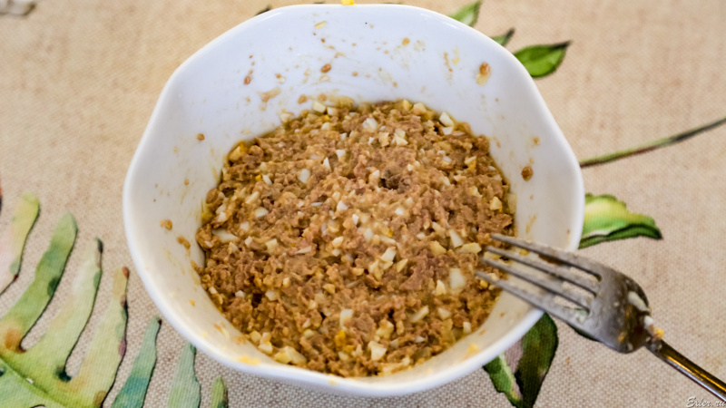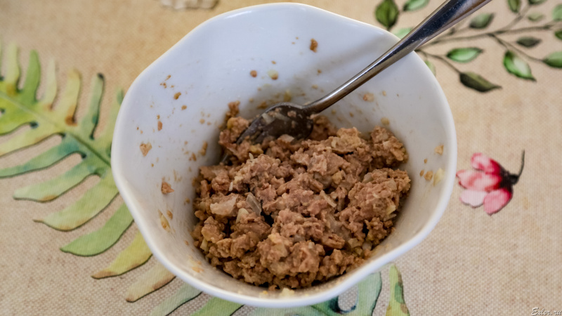 Масло из консервов нужно слить. Печень выкладываем в емкость и как следует разминаем вилкой до получения однородной массы.