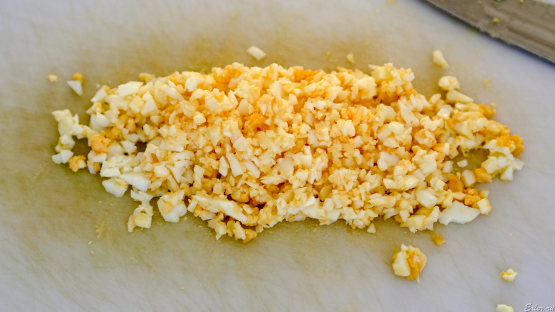 Возвращаемся к нашему салату. Очищаем яйцо и мелко-мелко его нарезаем. При этом обязательно нужно применить метод карающего ножа, описанный выше в разделе нарезания лука и чеснока, потому что яйцо (особенно белок) нужно как следует измельчить.