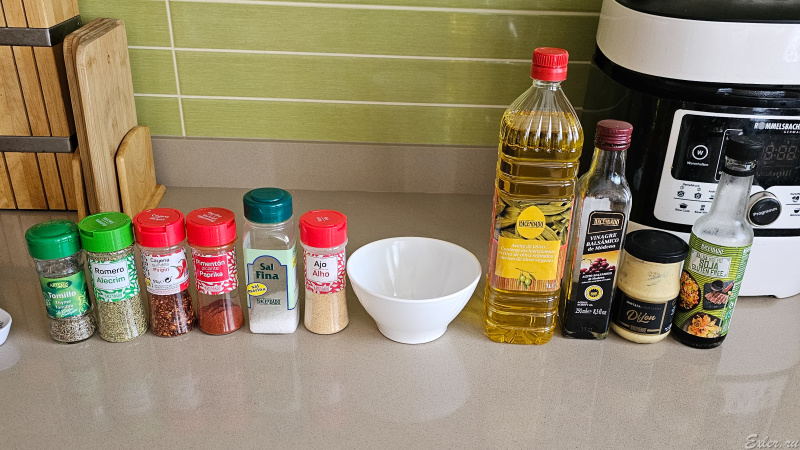 Для маринада нам потребуется: оливковое масло, соевый соус, бальзамический уксус, острая горчица, соль, сладкий красный перец, острый перец паприка, кайенский перец (по вкусу), розмарин, тимьян, сухой чеснок.