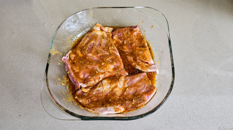 В Псковской области есть такой городок Великие Луки, а в нём есть Великолукский мясокомбинат. Он очень большой и пооткрывал своих фирменных магазинов во многих регионах в округе. Специализируется в основном на свинине. Так вот он в том числе выпускает полуфабрикаты в маринаде в вакуумной упаковке. Когда нам лень заниматься маринованием, то просто покупаем их. Обычно либо свиную шею, либо рёбра. Потом просто кладём в форму, закрываем фольгой и в духовку на 200 градусов. Мы любим помягче, поэтому подольше, конечно делаем.
