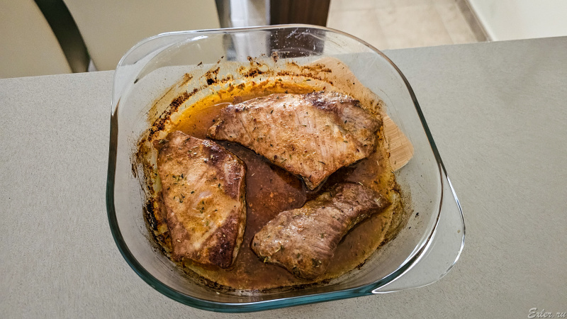 Пробуем - отлично! Мясо нежное, сочное, при этом сохранило упругую структуру, а сочетание жировой прослойки с маринадом дает очень богатые оттенки вкуса.