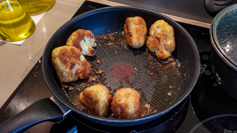 Следующий этап - соцветия обжариваются на сковородке в оливковом масле до получения золотистой корочки. Как вариант - обжарить слегка, после чего поместить в духовку на верхний-нижний нагрев в 200 градусов примерно на 10 минут, но тут нужно четко контролировать процесс и вытащить блюдо, когда корочка будет нужной кондиции.