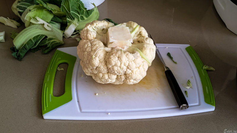 А еще я после отваривания соцветия сплющиваю где-то до 1-2 см толщиной. Получается что-то типа отбивной. Так она готовится равномернее и масла нужно меньше - за счет того что ее не нужно всю в масло окунать - а как любую отбивную жарим с одной стороны потом с другой