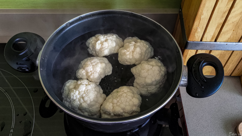 Ставим кипятиться воду, когда вода закипит - кидаем туда чайную ложку соли (и перец по вкусу), затем кидаем в кипящую воду соцветия (в холодную не кидать, чтобы контролировать процесс), после чего варим максимум 3-4 минуты (чтобы были приготовлены наполовину).