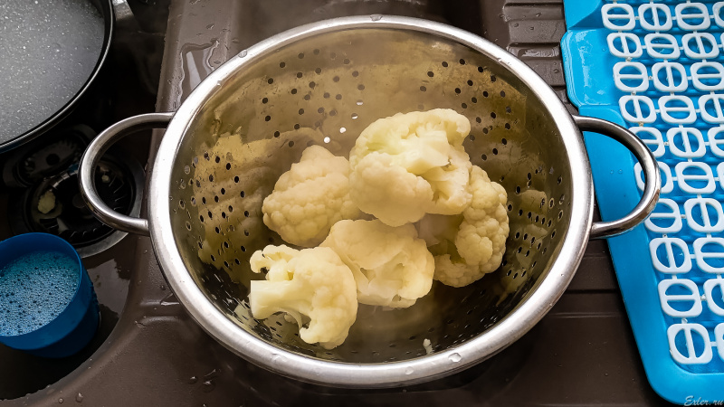 После этого скидываем соцветия в дуршлаг и как следует обдаем холодной водой: чтобы остановить приготовление, и чтобы с ними потом можно было дальше работать.