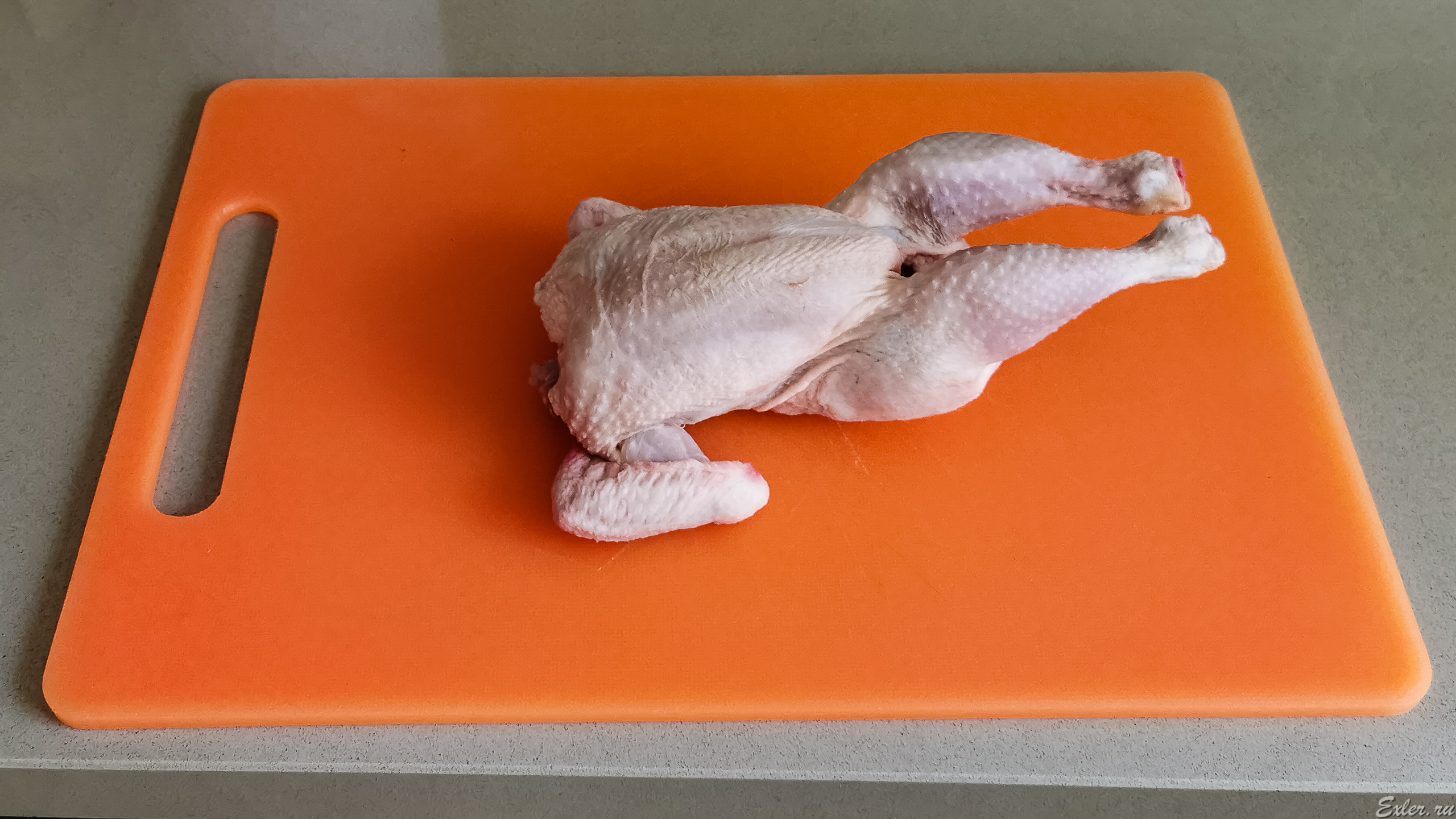 Разрезаем ее вдоль грудины так, чтобы тушку можно было распластать на сковородке. Также отрезаем крылья - чтобы они не мешали жарить тушку сверху.