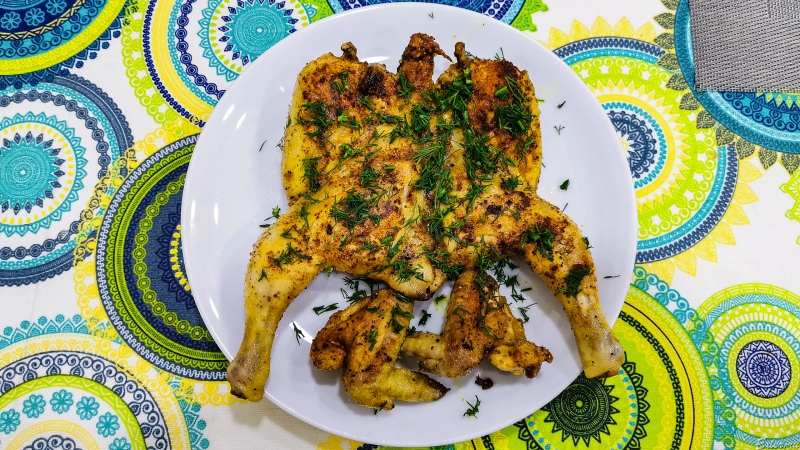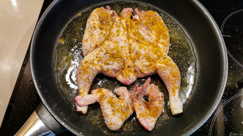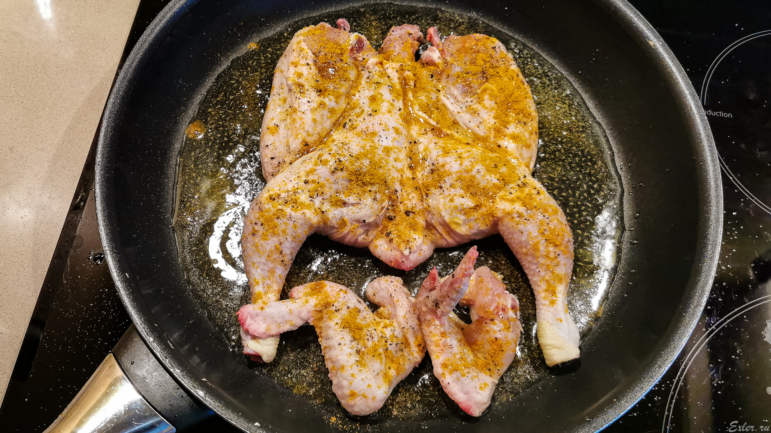 Процесс можно ускорить, если на неё положить кирпич, а ещё лучше два, то получится прекрасный циплёнок (ну или курица) табака за 25-35 минут.