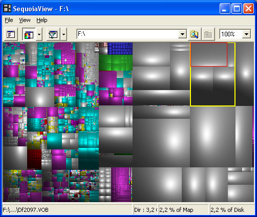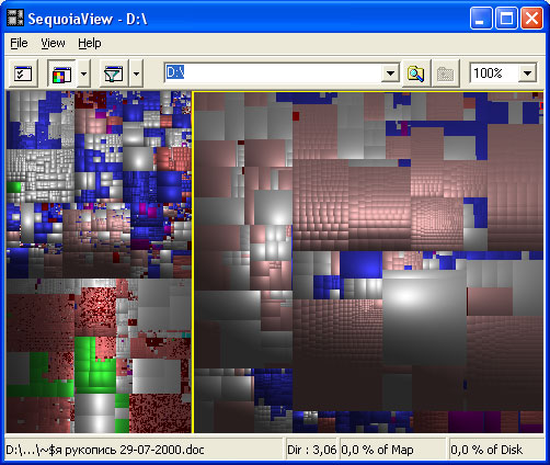 Прислали ссылку на очень забавную программку под названием SequoiaView. Программка делает визуальное представление файлов вашего диска, причем так, что вы сразу видите наиболее "пухлые" папки и наиболее пухлые файлы. Причем еще можно цветами выделять разные типы файлов, и тогда все становится совсем наглядным. Вот, например, мой диск D (рабочий):