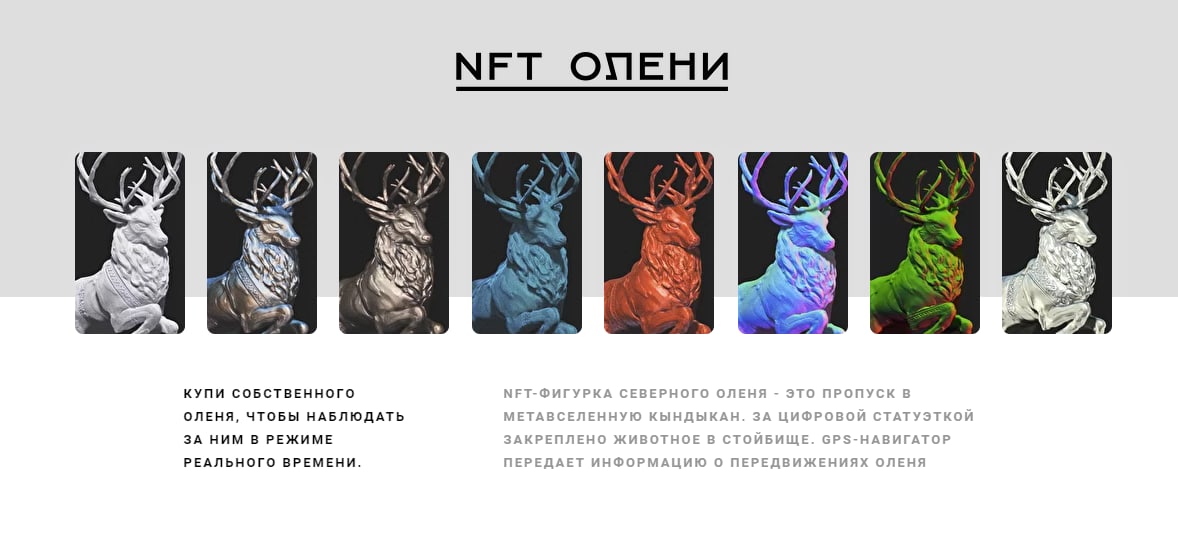 Как отметила руководитель объединения Маргарита Попова, проект открывает возможности дополнительного заработка оленеводов на создании NFT коллекций оленей и их продаже, а также продажи фьючерсов на панты оленей. (Отсюда.)