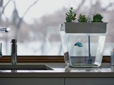 С "Аквафермой" непокорная рыбка работает, как настоящий агрономом. Схема простая: посадите рыбку в минималистичный бокс с водой, поставьте сверху зеленые насаждения на свой вкус, включите бокс в сеть. Все. Теперь осталось только кормить рыбку. Водяной насос поднимет продукты жизнедеятельности вашего питомца к корням растений, насыщая их удобрениями. Эх, прокатывало бы такое с кошками.