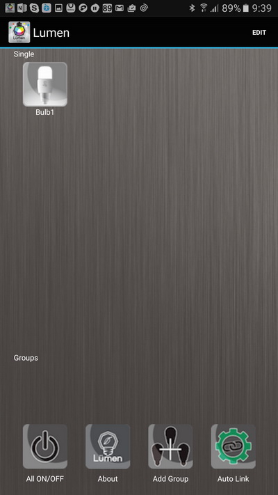 Теперь - самое главное. Скачиваем приложение Tabu Lumen на смартфон (для айфона тоже есть версия). Включаем Bluetooth. Запускаем. Приложение сразу видит лампочку (лампочки, группы лампочек).
