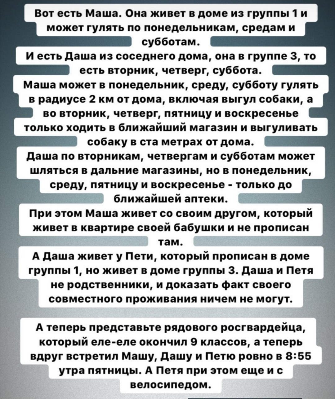 Зачем тратиться на цветы и вино для Машки из шестого барака, если она может прогуливаться по паркам по понедельникам и средам, а вы - по вторникам и пятницам? Зачем тратить свое время на Петьку из четвертого барака, если у него нет разрешения кататься на трамвае в любой день недели, а у вас есть? Все эти проблемы уже в прошлом! Мы всё продумали: встречайтесь, общайтесь и стройте отношения только с теми, кто равен вам по статусу поражения в правах и относится к тому же сорту податного населения, к которому вас отнесли столичные власти. Наше приложение покажет вам фотографии только тех, чей прогулочный график ограничения свободы передвижения полностью соответствует вашему. Забудьте о Машке, с которой вам все равно нельзя гулять по вторникам и пятницам! Мы покажем вам Ксению из ближайшего барака, с которой будет комфортно гулять в радиусе двух километров от места вашей изоляции!