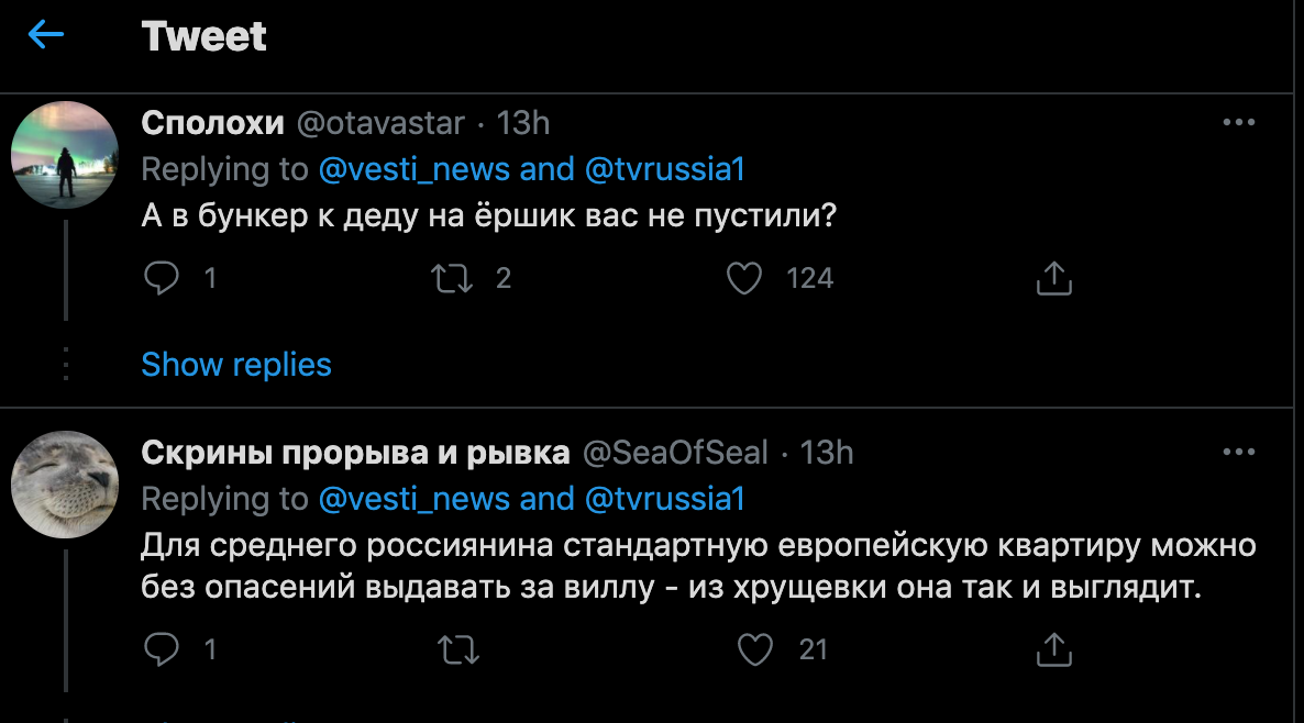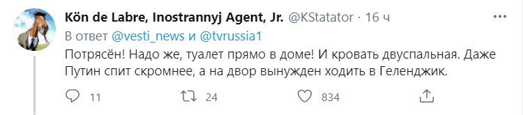 "Вести" показали "виллу Навального" в Германии. Это было реально очень смешно. Особенно порадовали очень скромные апартаменты, в которых корреспондентка - это был шок! - даже нашла унитаз и кладовку (как она самозабвенно размахивала пластмассовым ершиком - это что-то!), ну и на кухне обнаружилась еще и дорогущая бутылка вина за €1,75 - судя по всему, Навальный в Германии оттягивался вовсю! К "Вестям"-то, ясный пень, никаких вопросов вообще нет - какую убогость нарыли, такую и состряпали, а вот комменты там под записью очень веселые.