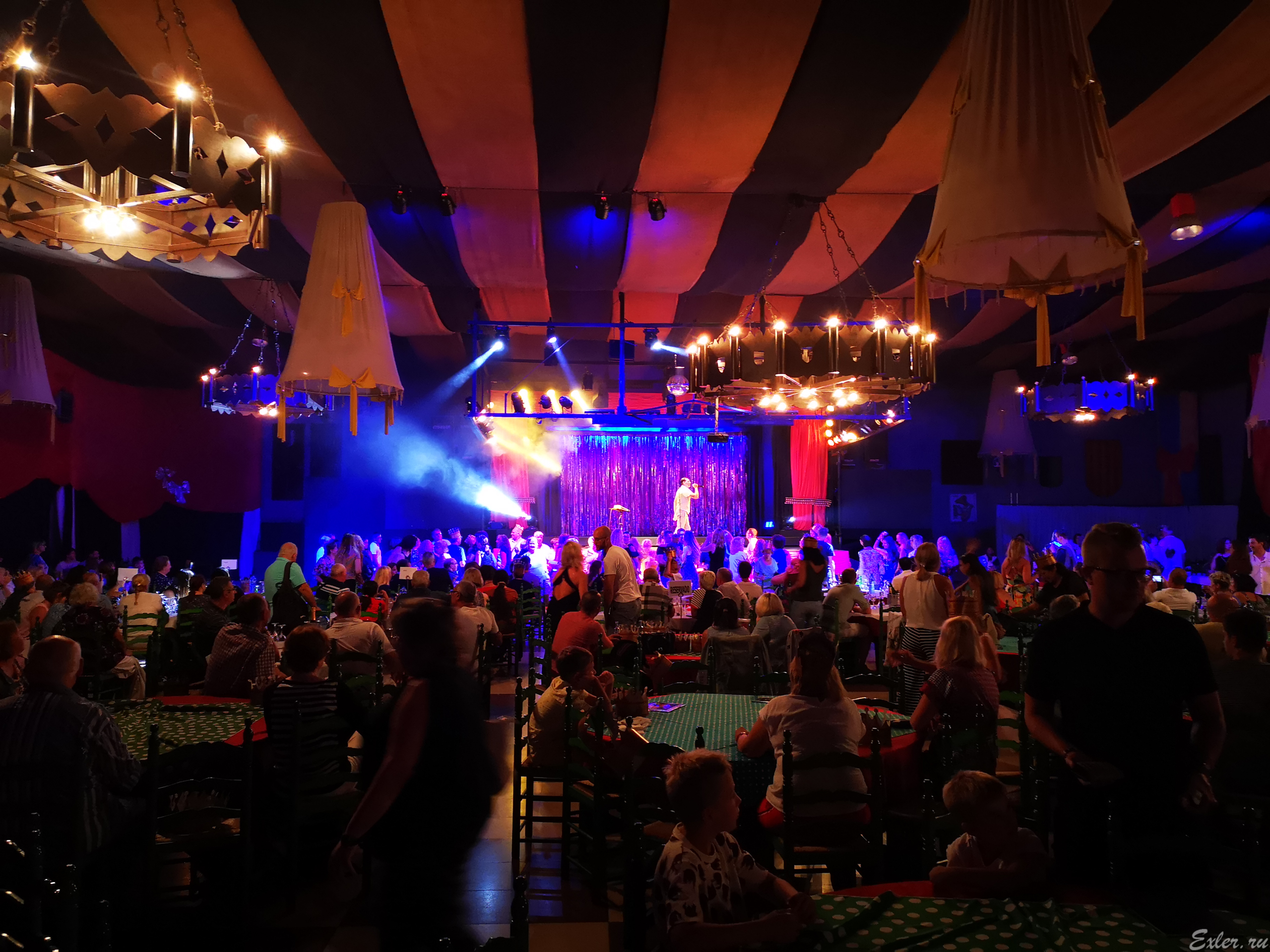 Нам, в общем-то, вполне понравилось. Рыцарское шоу хорошо продумано и демонстрирует интересную драматургию, выездку участники делают отлично, да и драки на мечах и дубинах поставлены здорово. Фламенко-шоу сделано по всем законам чисто туристических аттракционов, но исполняется хорошо, костюмы эффектные и разнообразные, так что я в них камень не кину ни разу. А еще там был совершенно потрясный гитарист, у которого был сольный номер. И это был полный восторг - настоящее фламенко, причем еще и поразительно техничное. Жаль только что звук в колонках был просто ужасный - звукооператора убивать надо: в результате идиотских настроек потрясная техника гитариста превращалась в сплошной резонирующий гул, в котором сложно что-то было разобрать.