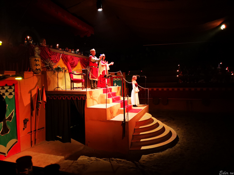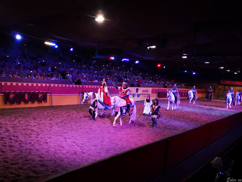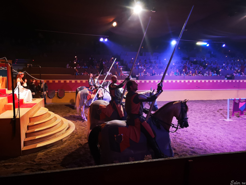 Был на этом шоу в 11 году. Там сценарий был другой: четыре рыцаря сражались между собой за какой-то приз (бои на мечах, попадание копьями в мишени и т.п.), но потом, ещё до того, как определился победитель, пришёл мерзкий колдун и украл приз. Тогда рыцари объединились, пошли отобрали приз у колдуна с его приспешниками и по-братски поделили. И тоже зрителям в зависимости от места назначали, за кого из рыцарей болеть. Двух из тех рыцарей я узнал на фотографиях в этой статье.