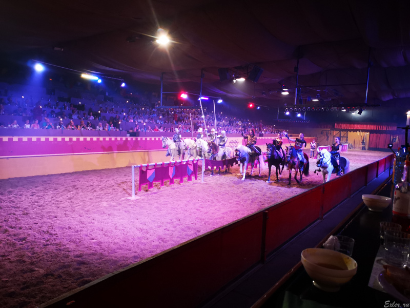 На втором этаже - арена для выступлений рыцарей, зрители сидят за столами, на которых расставлены бутылки с вином и напитками. Перед теми, кто оплатил полный ужин, стоит глубокая тарелка, рядом с которой лежит здоровенный кусок хлеба. Когда начнется шоу, в тарелку нальют похлебки. Приборы не дают - в средние века приборами не пользовались. После супа принесут половинку курицы на гриле и половинку здоровой картофелины.