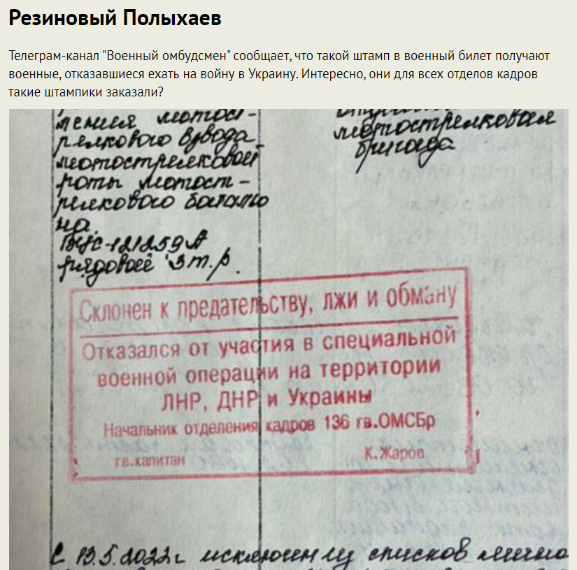 Задавался я вопросом: они на всех начальников отделов кадров и командиров изготовили резиновые штампики по поводу "уклонения от проведения спецоперации", а если говоря нормальным языком - отказа от участия в бесчеловечной бойне в Украине? Как выяснилось, на всех заготовили. Иначе это же сколько от руки-то писать придется, правильно?