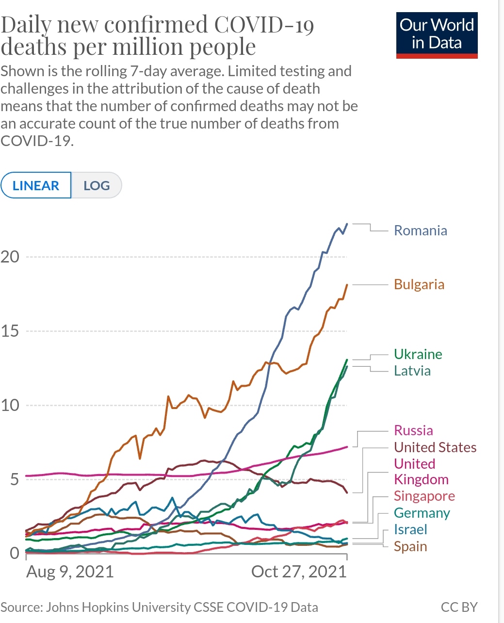 В самой уязвимой группе риска привито только 65%, я думаю, это и причина. В Германии, например, в группе 60+ привитых 85%. По группе 80+ отдельных данных нет, но думаю, что привито намного больше 90%.