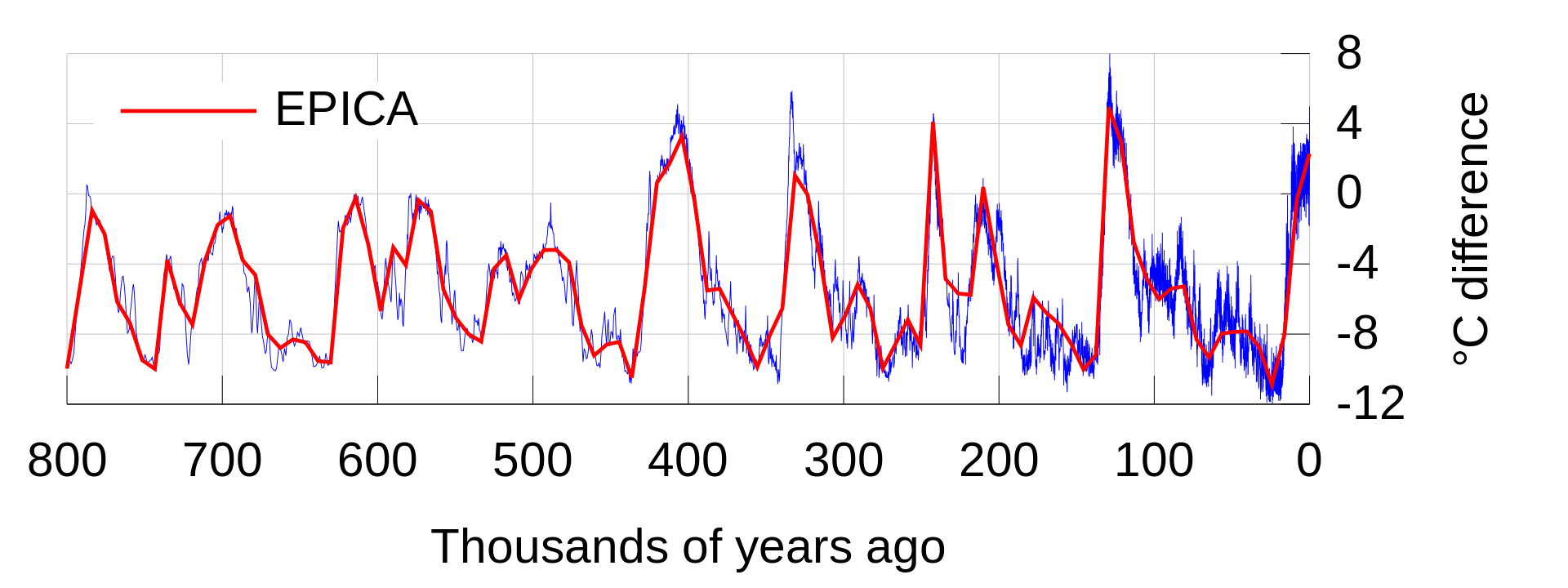 Масштаб характерных изменений на нижнем графике - сто тысяч лет.