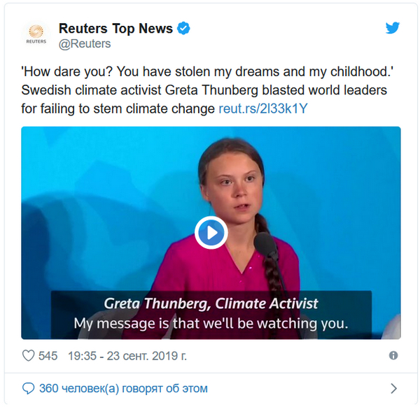 В 2018 году шведская школьница Грета Тунберг устроила забастовку возле здания парламента в Стокгольме, заявив, что отказывается ходить в школу по пятницам, пока политики не будут выполнять Парижское соглашение по климату. Акция Тунберг привлекла внимание во всем мире, и школьники из других стран тоже начали устраивать климатические забастовки. Сама Тунберг была номинирована на Нобелевскую премию мира, начала общаться с политиками и посещать международные конференции. В августе 2019 года она пересекла Атлантический океан на парусной яхте, чтобы добраться до Нью-Йорка и принять участие в саммите ООН по изменению климата. На открытии саммита 23 сентября Тунберг выступила с эмоциональной речью. (Отсюда.)