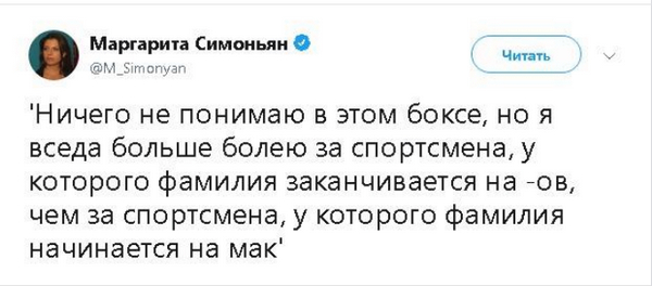 Надеюсь, наш великий хоккеист Макаров не читал данного сообщения. К тому же, Кеосоянша не только в боксе плохо понимает - в российских футбольных клубах полно иностранцев, например. Ну и самое главное, после сегодняшней выходки Хабиба я за него болеть не буду и мне глубоко пофиг на какие буквы его фамилия заканчивается.
