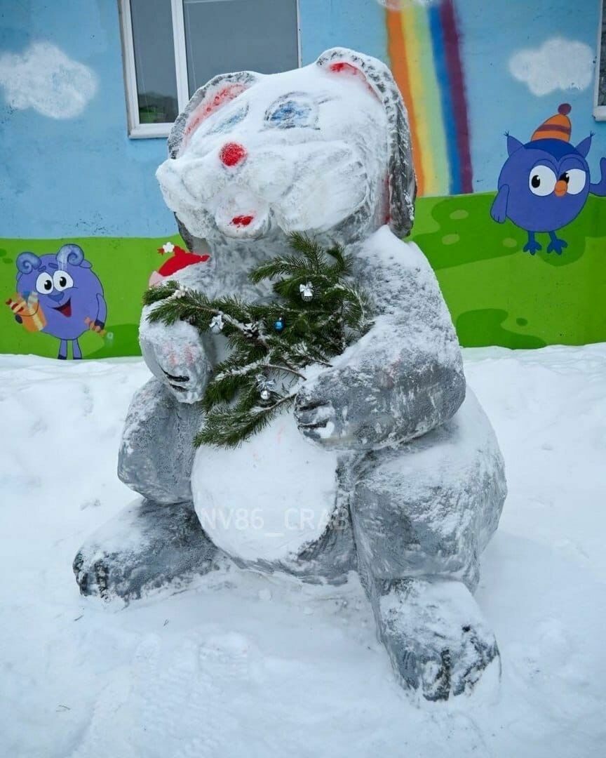 Народным умельцам удалось механизировать изваяние — двухметровый заяц может стучать лапками по барабану. (Отсюда.)