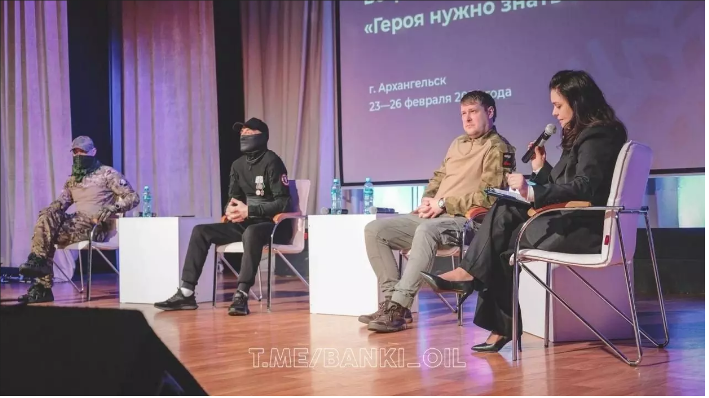 какой-то сильно побитый жизнью и молью мужичок в камуфляжке и иконкой на рукаве перед школьниками